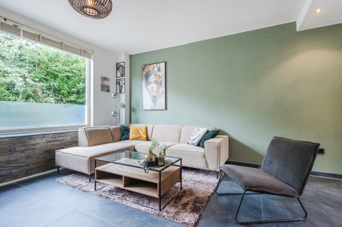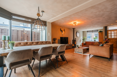 - Lichte woonkamer met PVC vloer, vloerverwarming en openslaande deuren naar de tuin